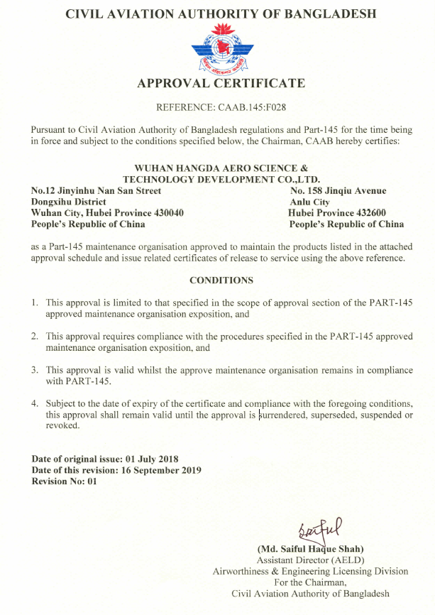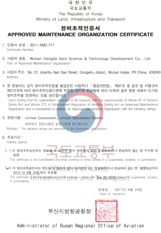 2001年10月 公司獲中國民航總局授權的民航維修許可證。